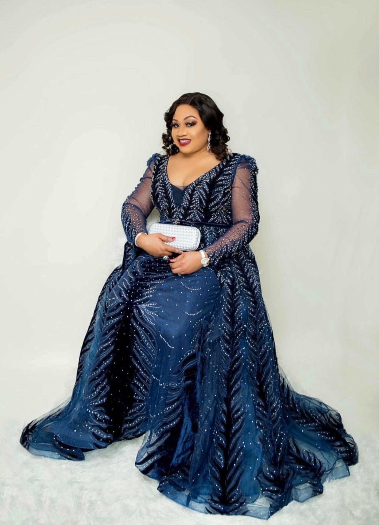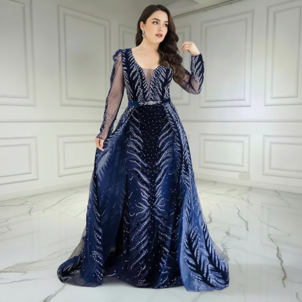 Elevate your formal wardrobe with this exquisite navy evening gown, meticulously crafted for those who demand sophistication. The striking deep V-neckline and sheer long sleeves create an alluring silhouette, whilst the fitted bodice gracefully transitions into a sweeping full-length skirt. Hand-applied crystals and intricate beadwork catch light with every movement, delivering understated luxury perfect for weddings, galas, and prestigious events. Each dress is individually prepared to the highest standards.